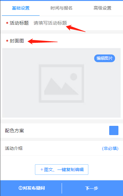 第二步:进入活动制作页后,【基础设置】->填写标题、上传封面图,【时间与报名】->设置投票的开始与结束时间、开启开放报名,然后下一步直接发布活动;